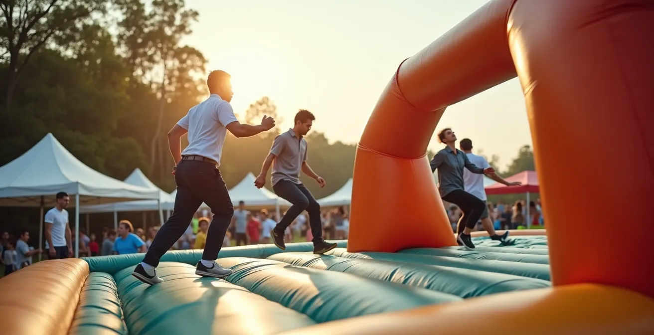 La transition brutale d’une présentation PowerPoint formelle vers un challenge gonflable crée une dissonance cognitive. Les participants ont besoin d’une phase intermédiaire : explication des règles compétitives, formation des équipes équilibrées, peut-être une démonstration humoristique par les organisateurs. Cette préparation progressive autorise mentalement la transgression ludique à venir.